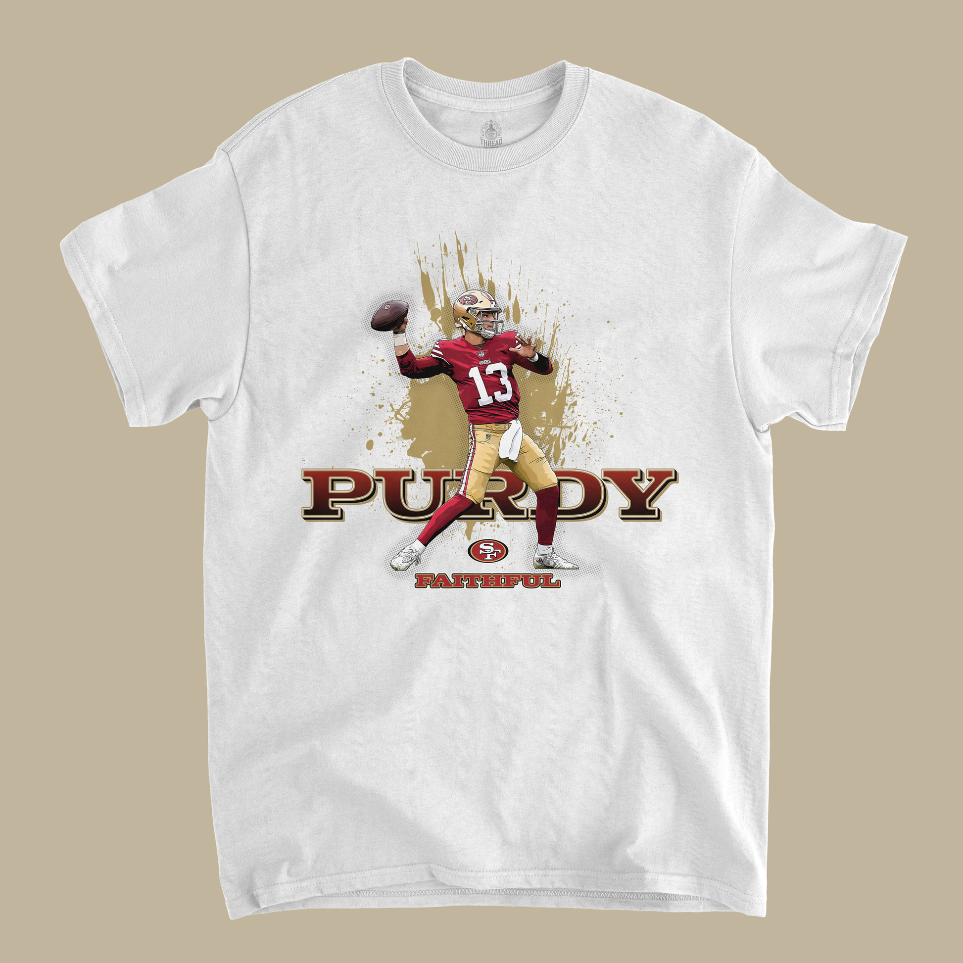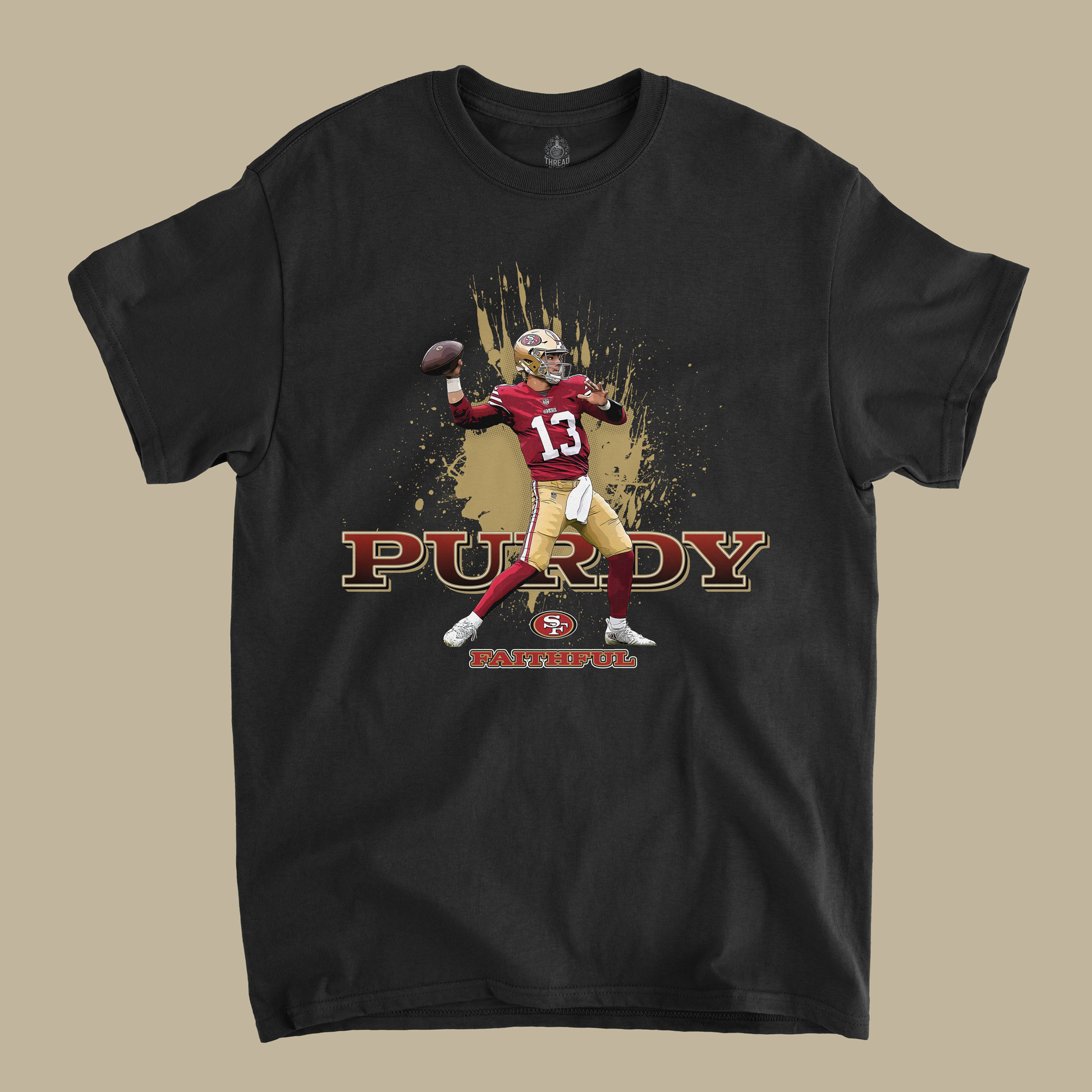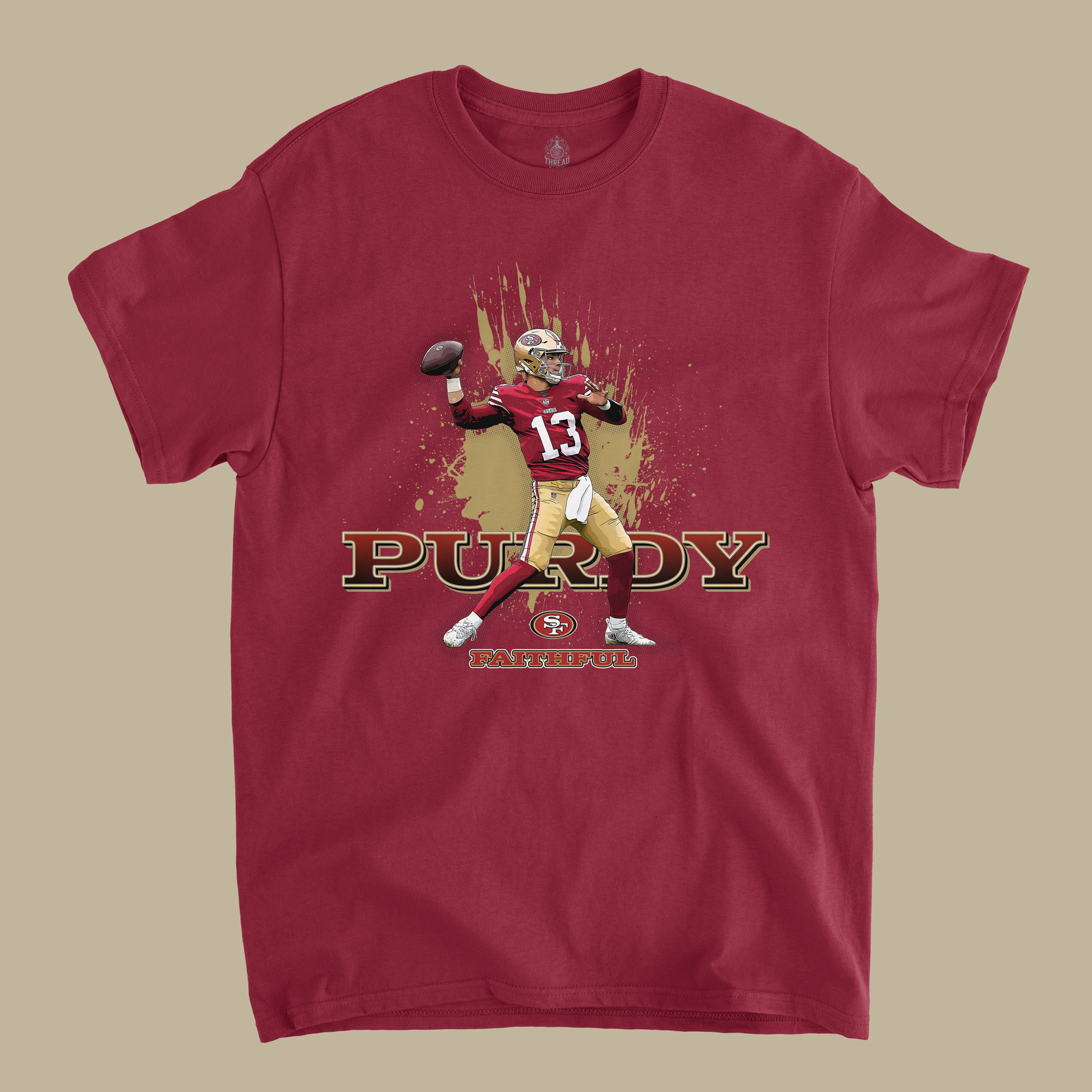 This design features s an eye-catching image of Brock Purdy in a powerful throwing form, captured mid-motion, with his arm extended, ready to launch the football. The dynamic splatter background bursts with energy, blending shades of red, gold, and black, giving the design a gritty, action-packed feel. Across the top, "Purdy" is printed in bold, oversized letters, making a strong statement in the San Francisco 49ers' signature colors. The combination of the dynamic pose, energetic splatter effect, and bold lettering creates a standout look, perfect for fans wanting to show off their support for the team's rising quarterback.