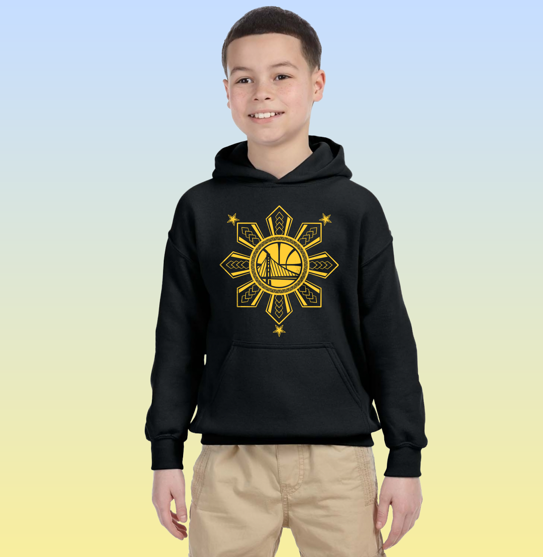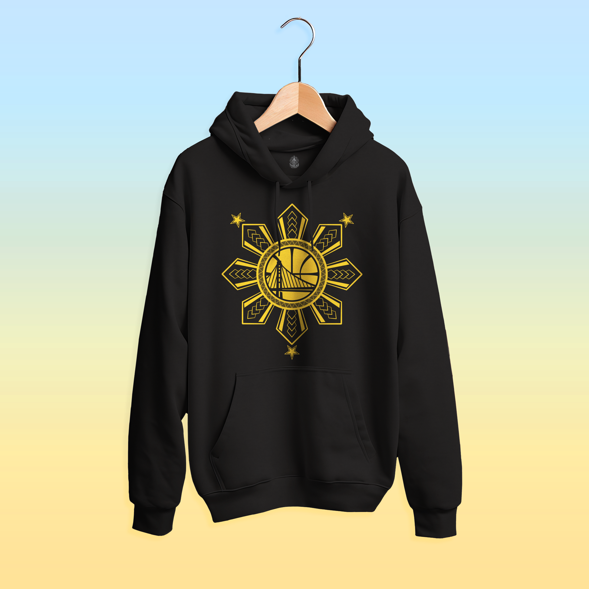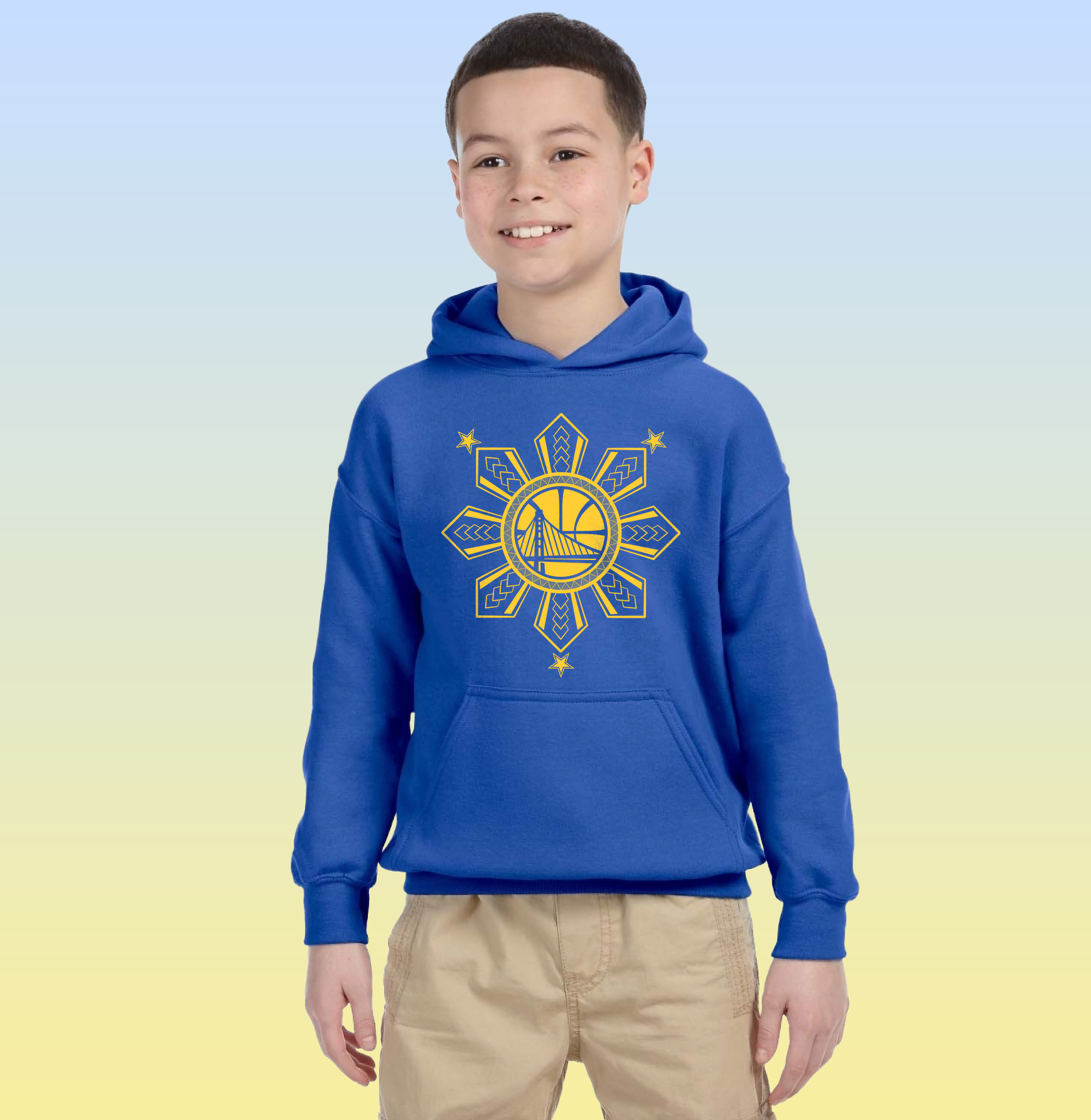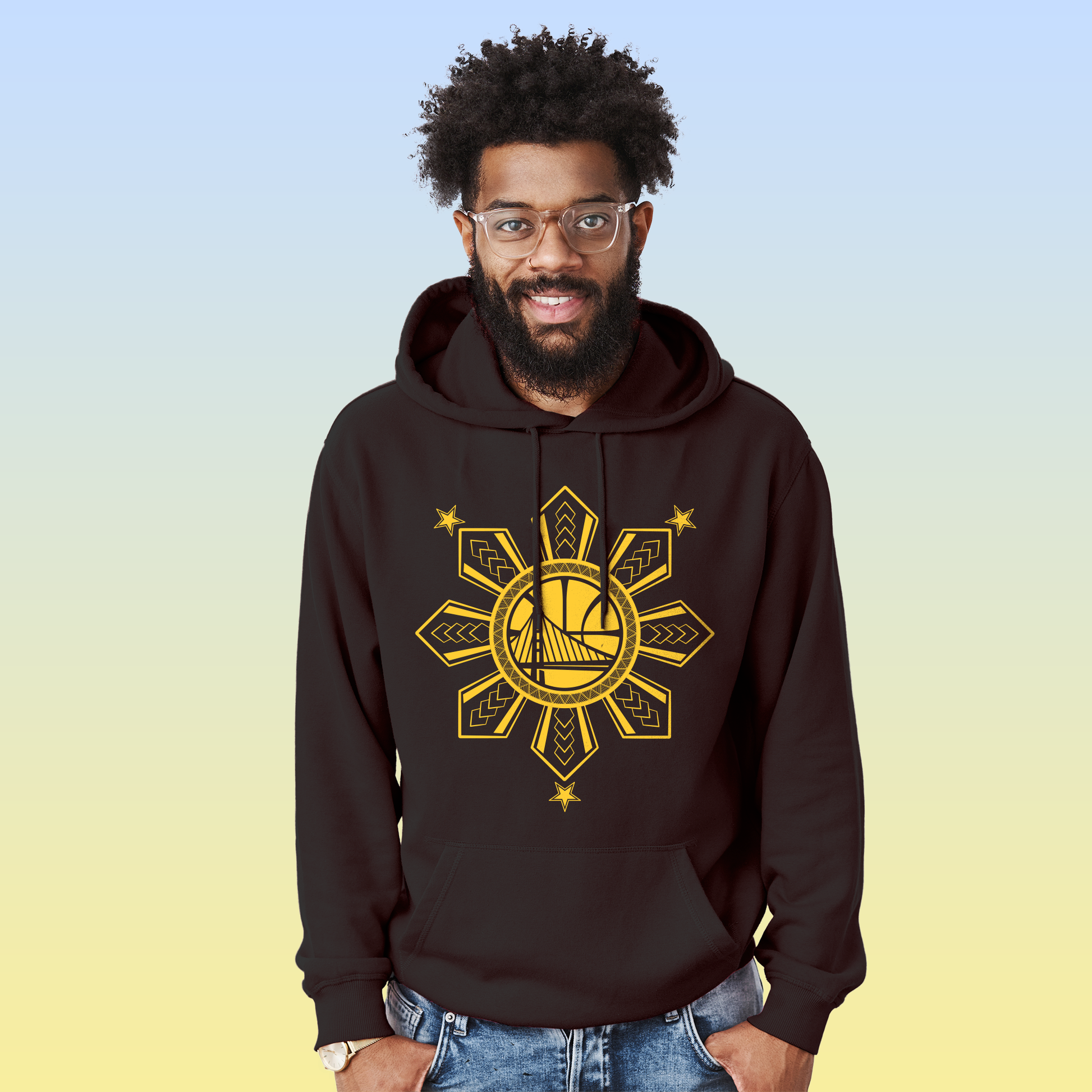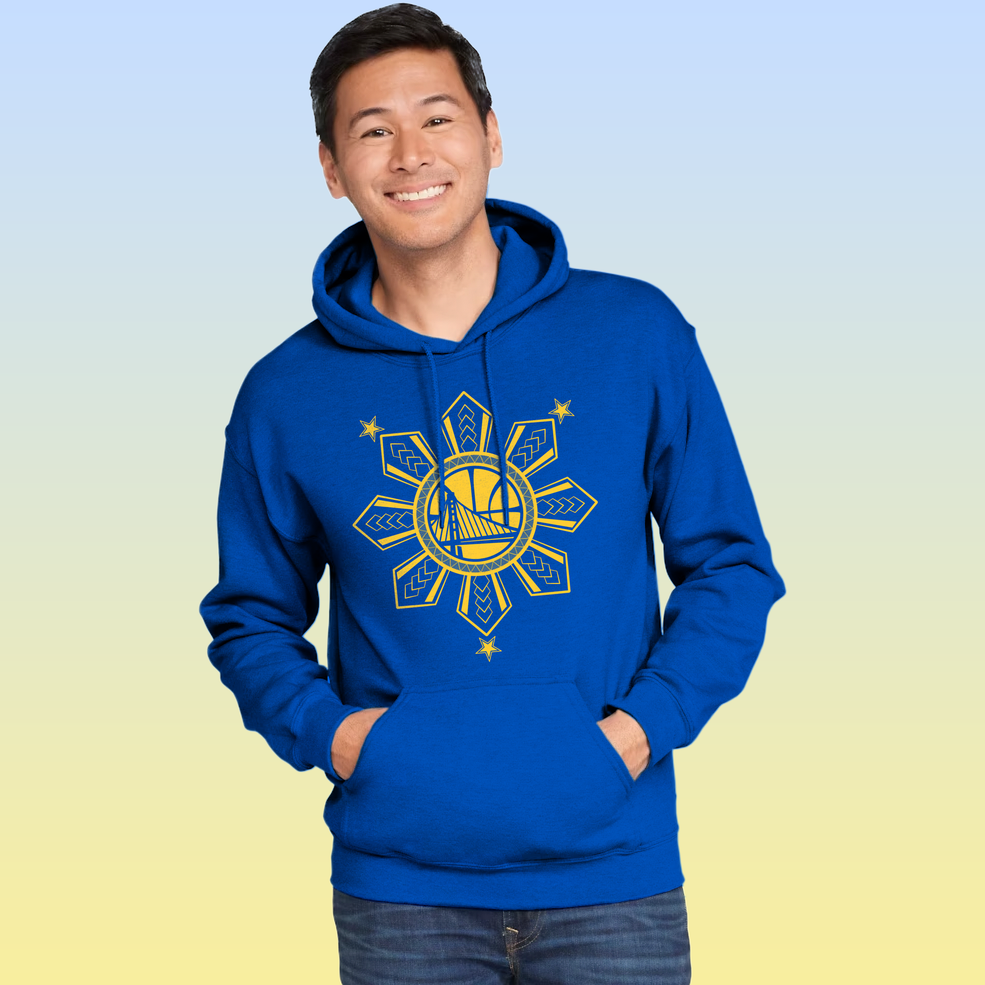 This design features a stylized golden sun inspired by the Philippine flag, incorporating intricate patterns and the Golden State Warriors' bridge logo at the center. Surrounding the sun are small golden stars, adding a dynamic and cultural touch. Printed on a vibrant royal blue hoodie, the design is bold and eye-catching, celebrating both Filipino heritage and basketball pride.