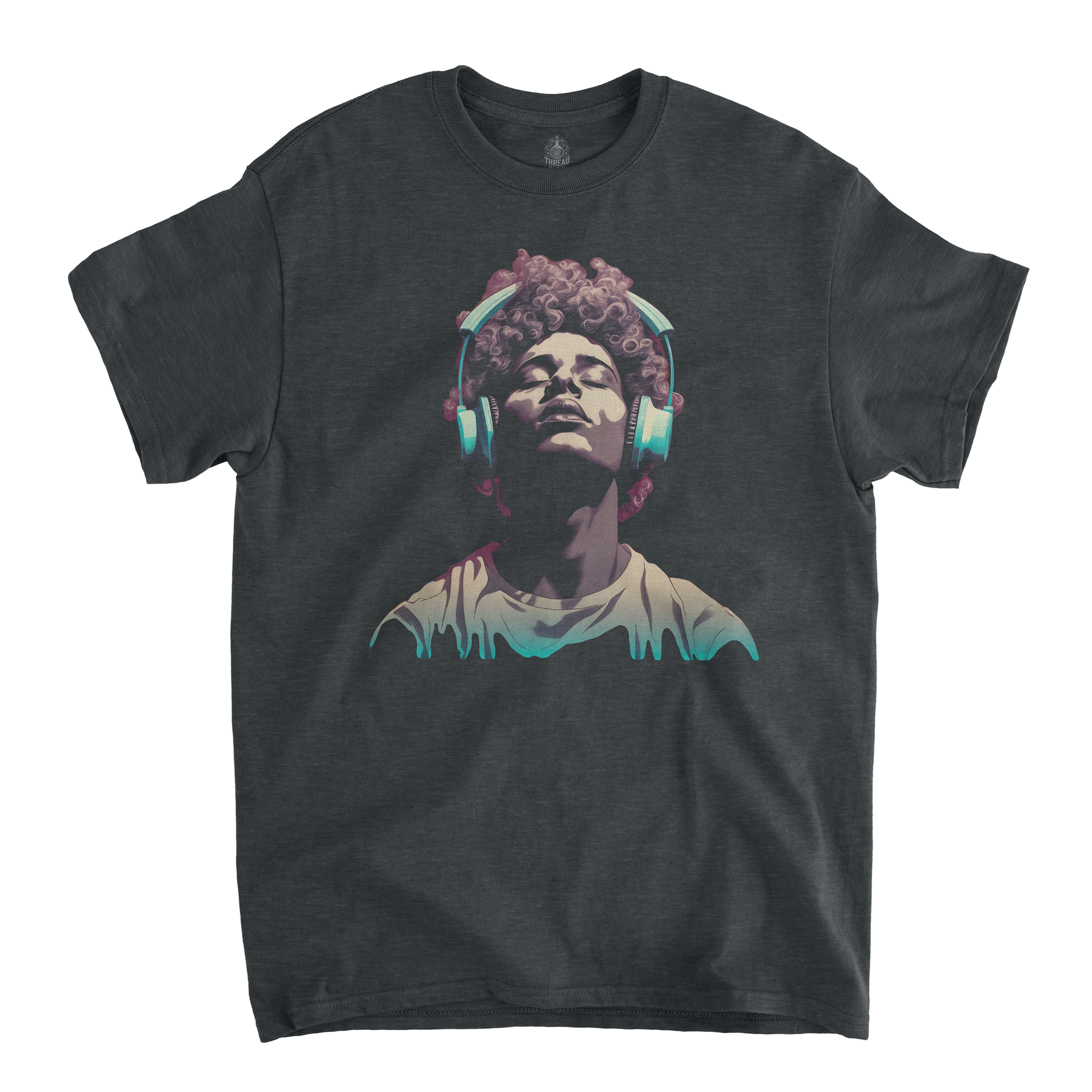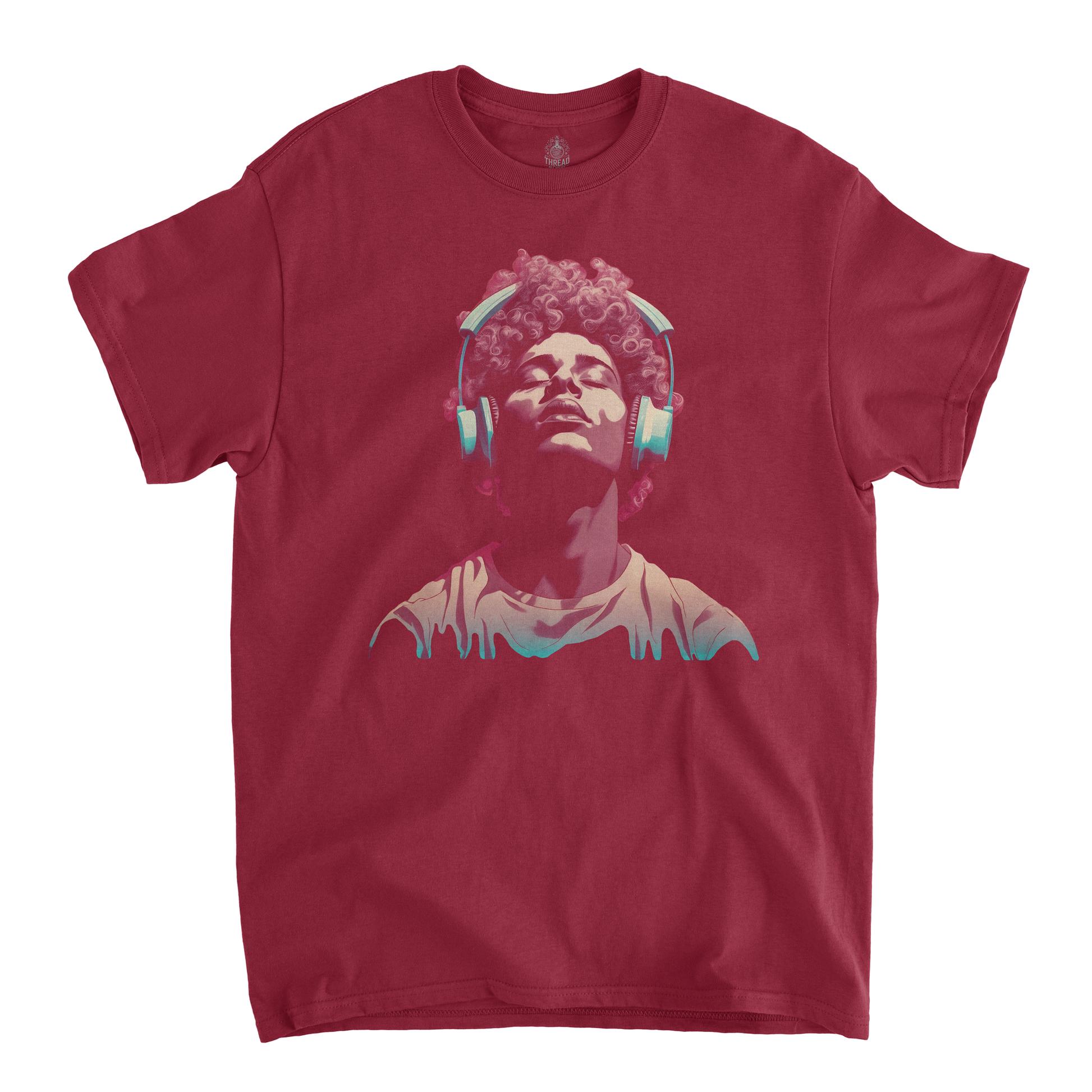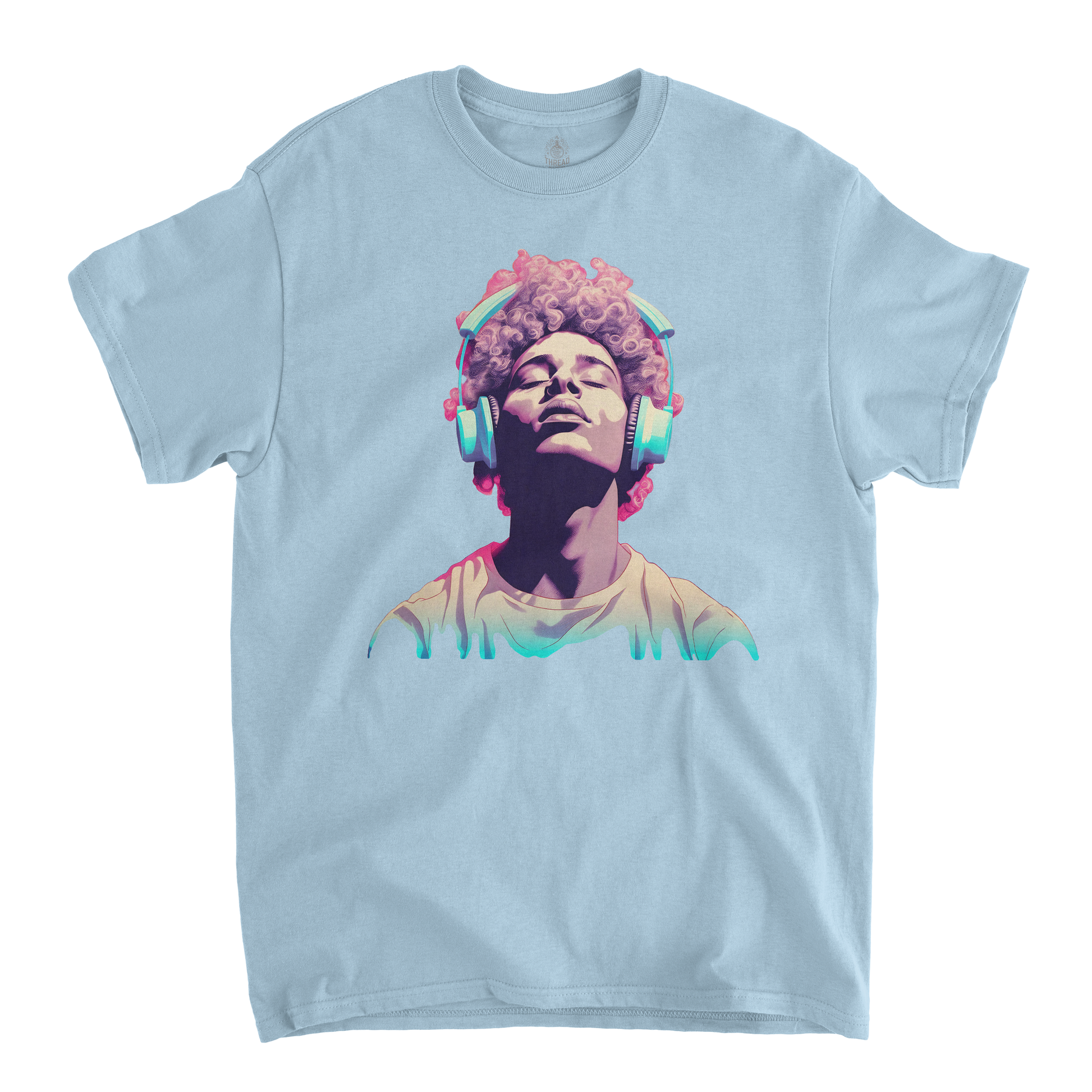 This graphic T-shirt features a minimalist illustration of a young man wearing large, vintage-style headphones. The muted, nostalgic color palette of faded blues, washed-out pinks, and soft grays gives the design a retro vibe, evoking a sense of quiet introspection. The young man’s expression is calm and thoughtful, as if lost in his own world of music. The design is placed centrally on the shirt, with a soft, slightly worn look, perfect for casual wear with a vintage aesthetic.