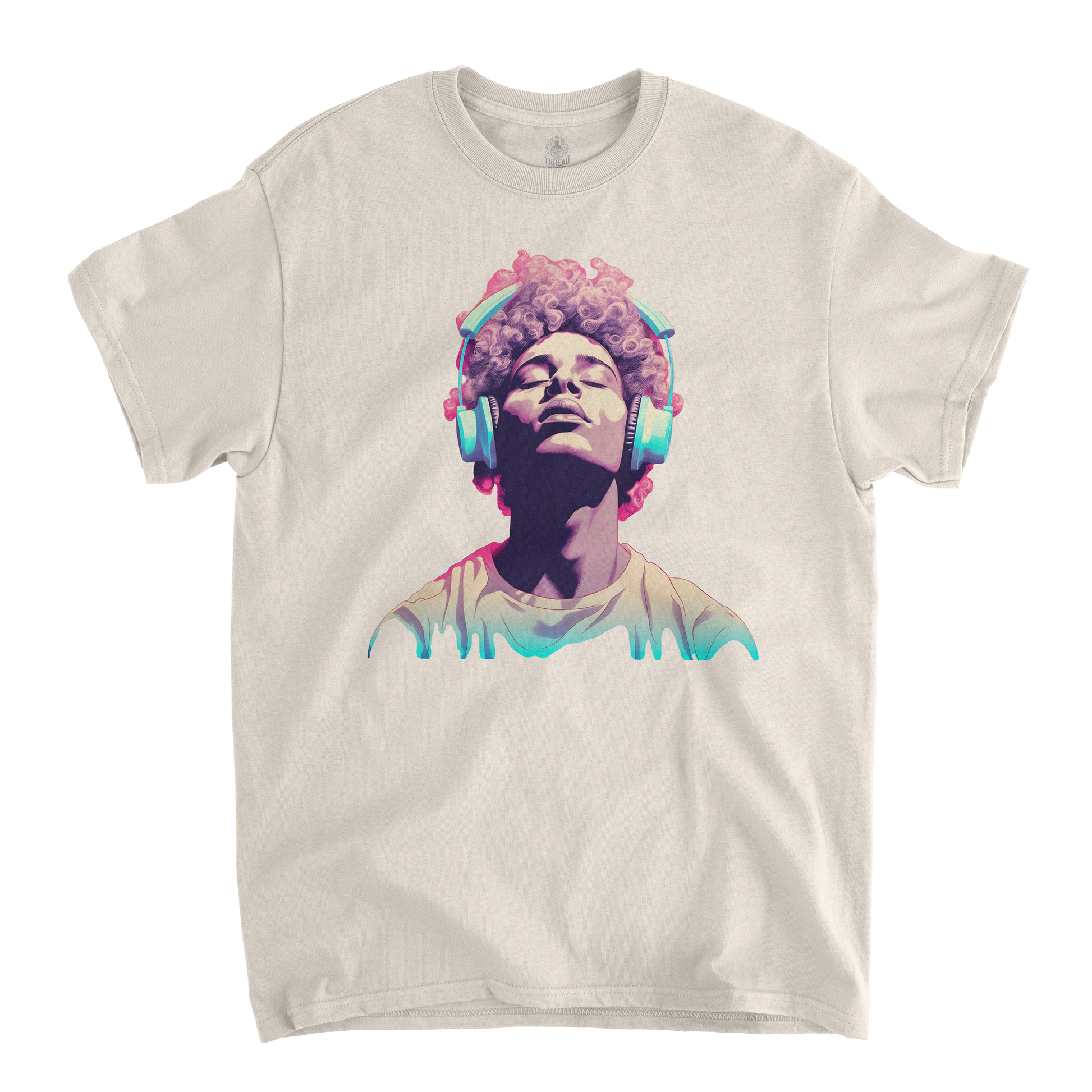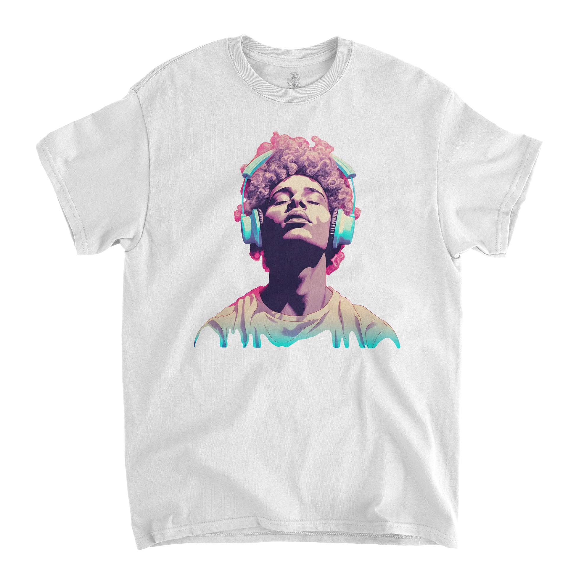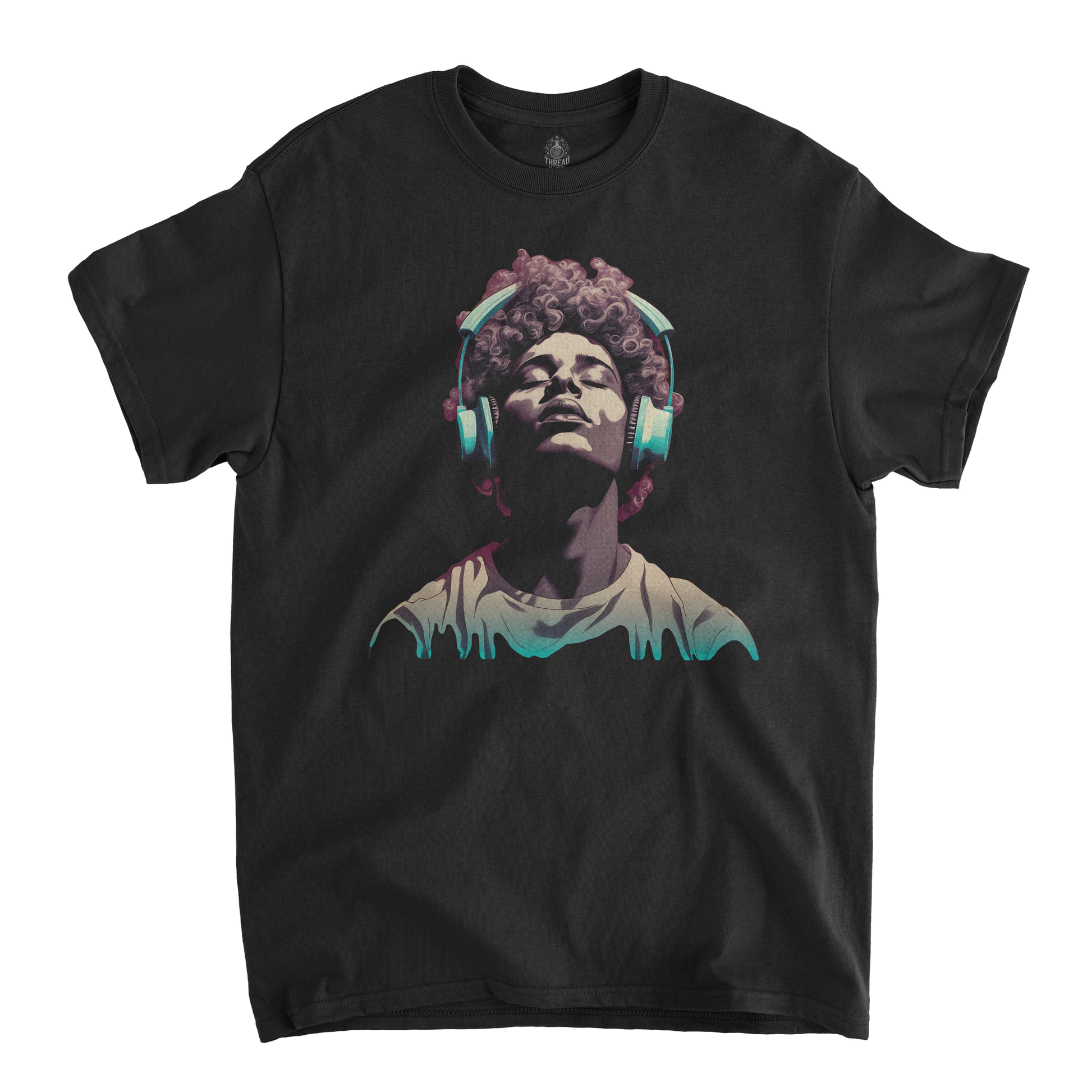 This graphic T-shirt features a minimalist illustration of a young man wearing large, vintage-style headphones. The muted, nostalgic color palette of faded blues, washed-out pinks, and soft grays gives the design a retro vibe, evoking a sense of quiet introspection. The young man’s expression is calm and thoughtful, as if lost in his own world of music. The design is placed centrally on the shirt, with a soft, slightly worn look, perfect for casual wear with a vintage aesthetic.