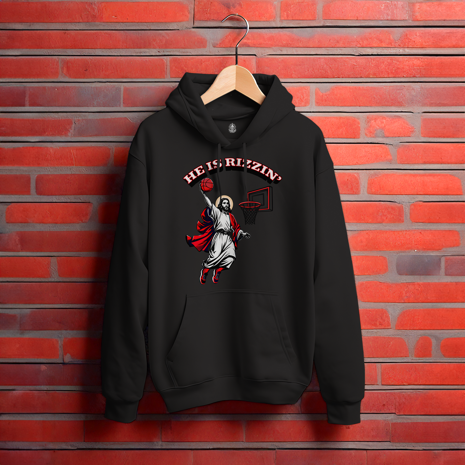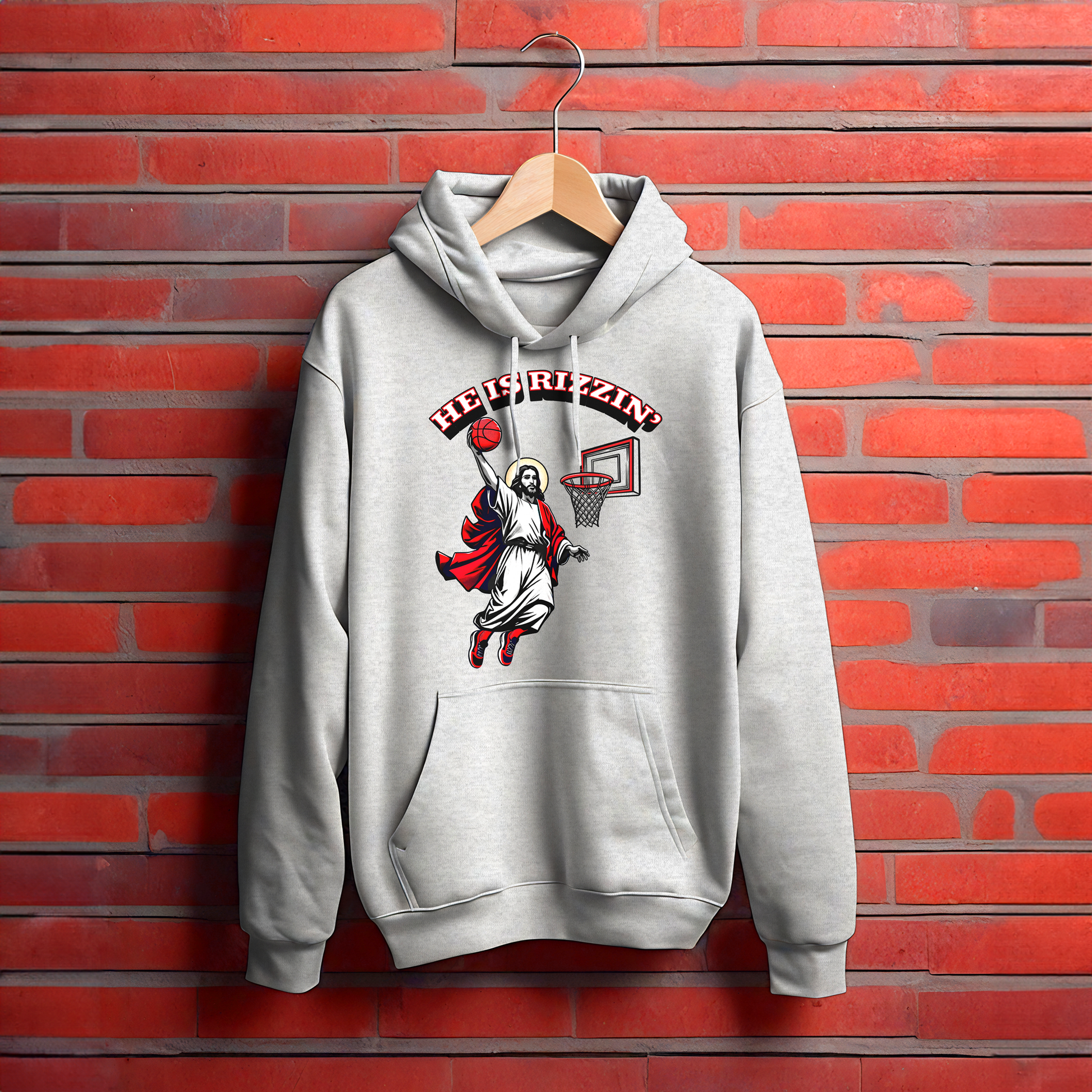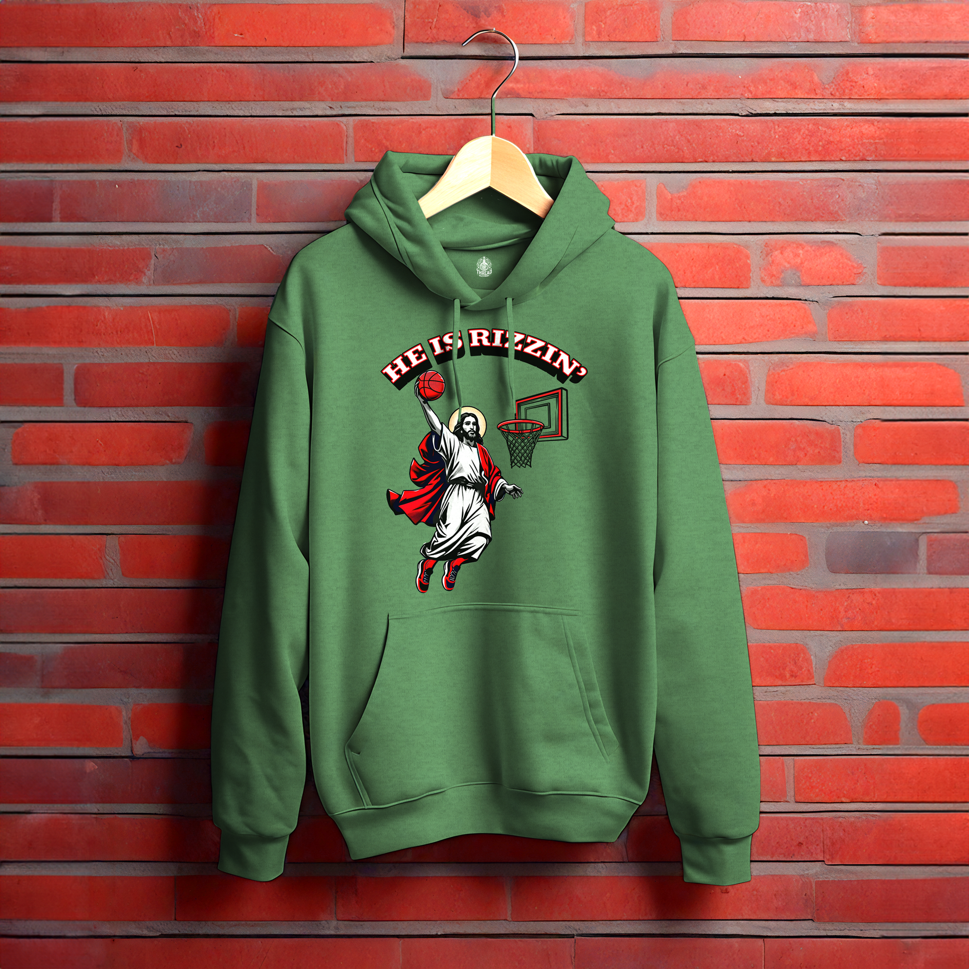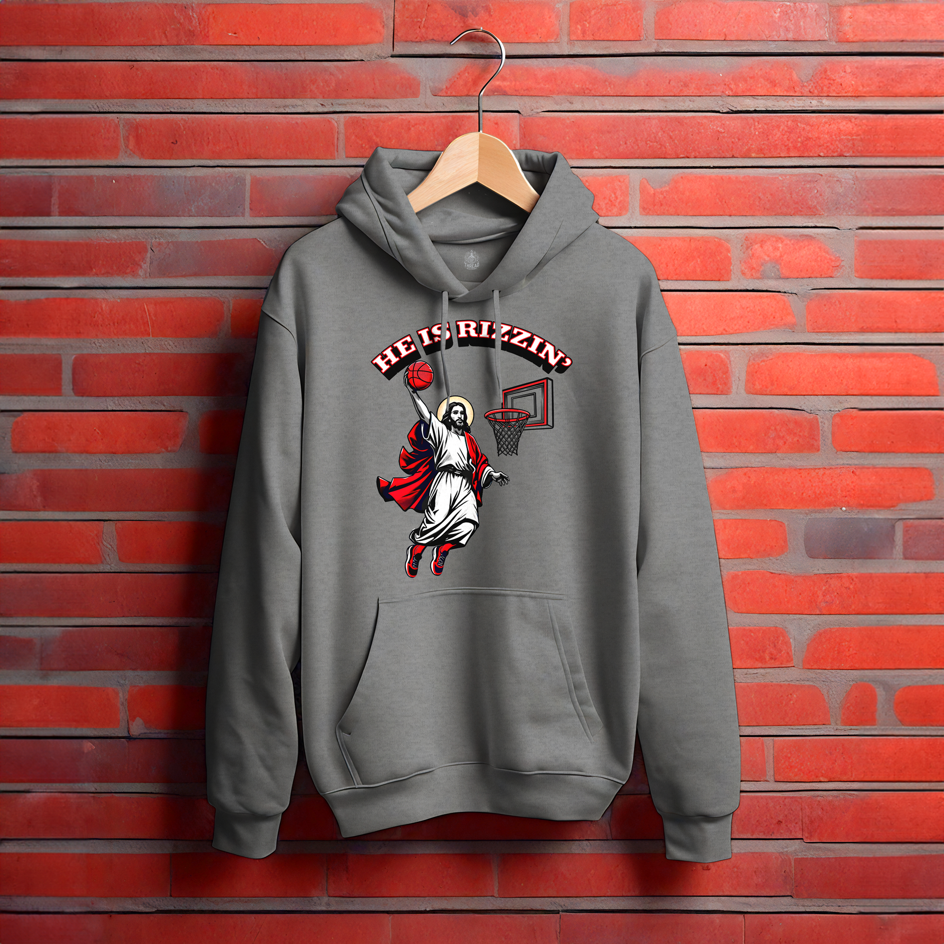 This t-shirt design features a bold and dynamic illustration of Jesus in mid-air, dunking a basketball with flair. He's captured at the peak of the dunk, with a determined yet serene expression. His flowing robes, modernized with a sporty edge, billow dramatically as he soars above the rim. The phrase "He Is Rizzin'" is prominently displayed in a cool, athletic-style font. The play on words—mixing the concept of resurrection with the Gen Z slang "rizz" (meaning charisma)—adds a fun, modern twist. The design blends faith, humor, and pop culture seamlessly, making it a standout conversation piece.