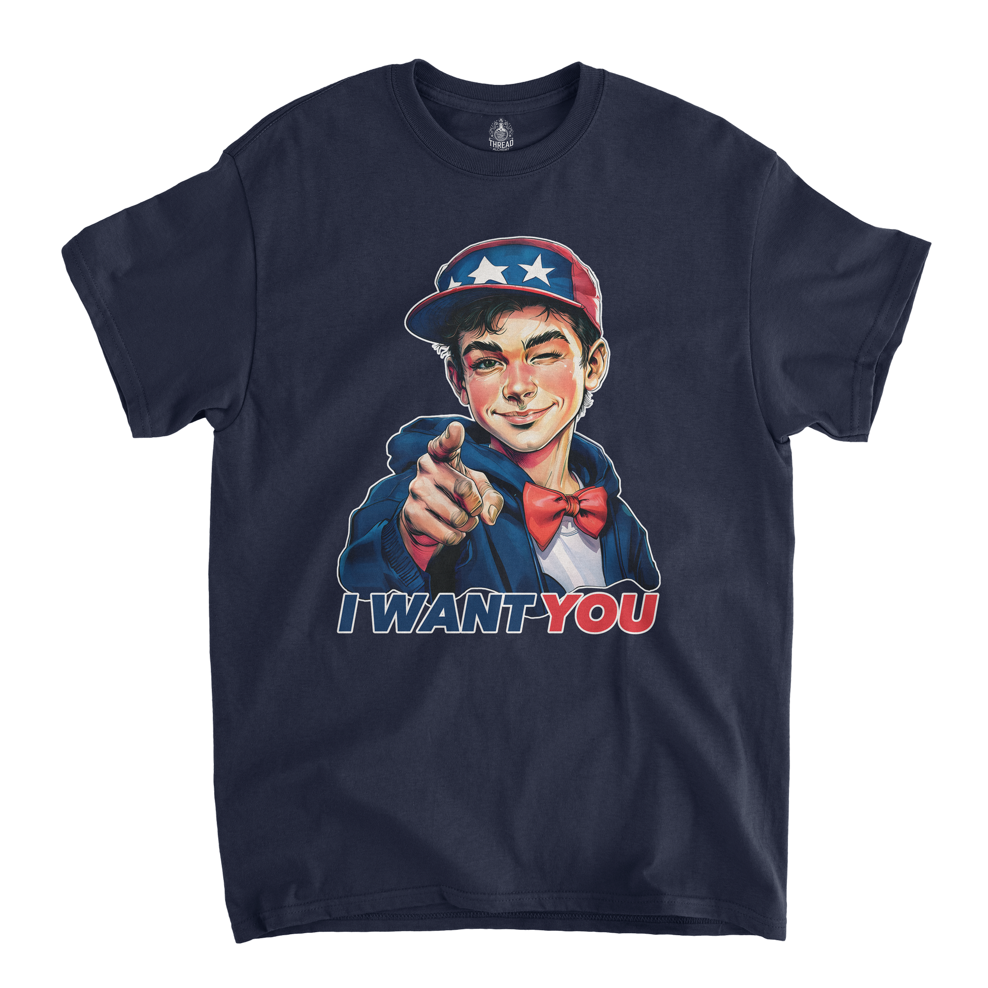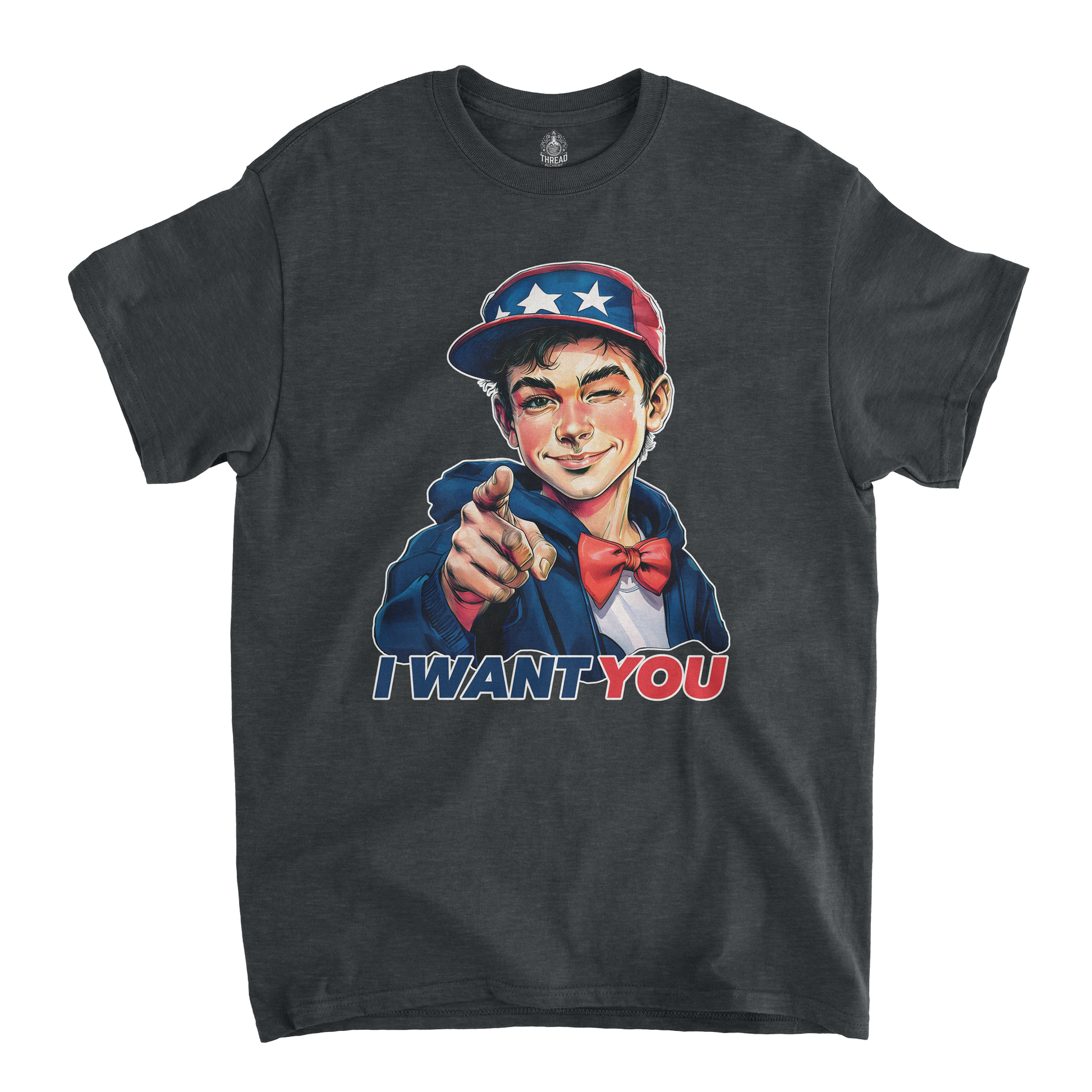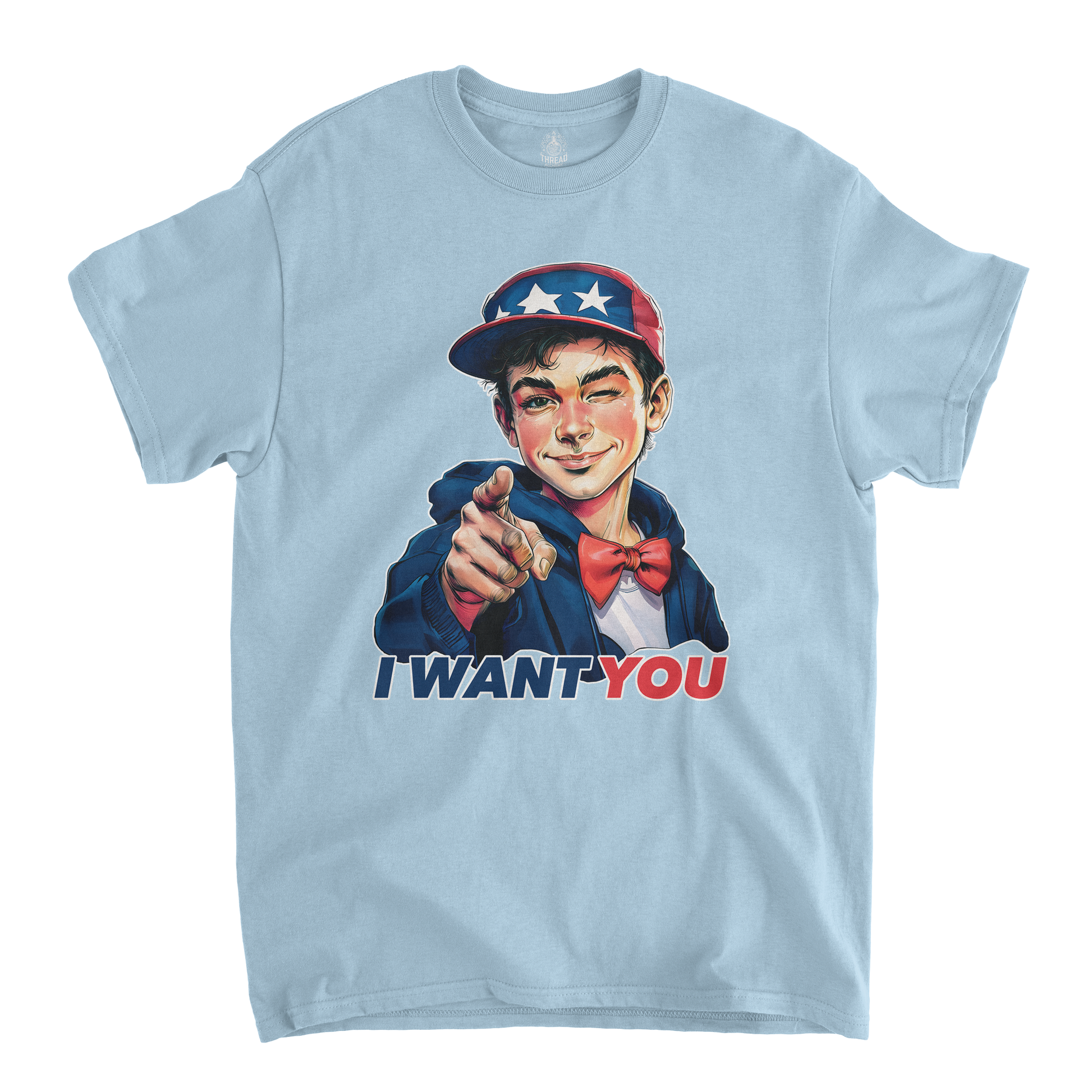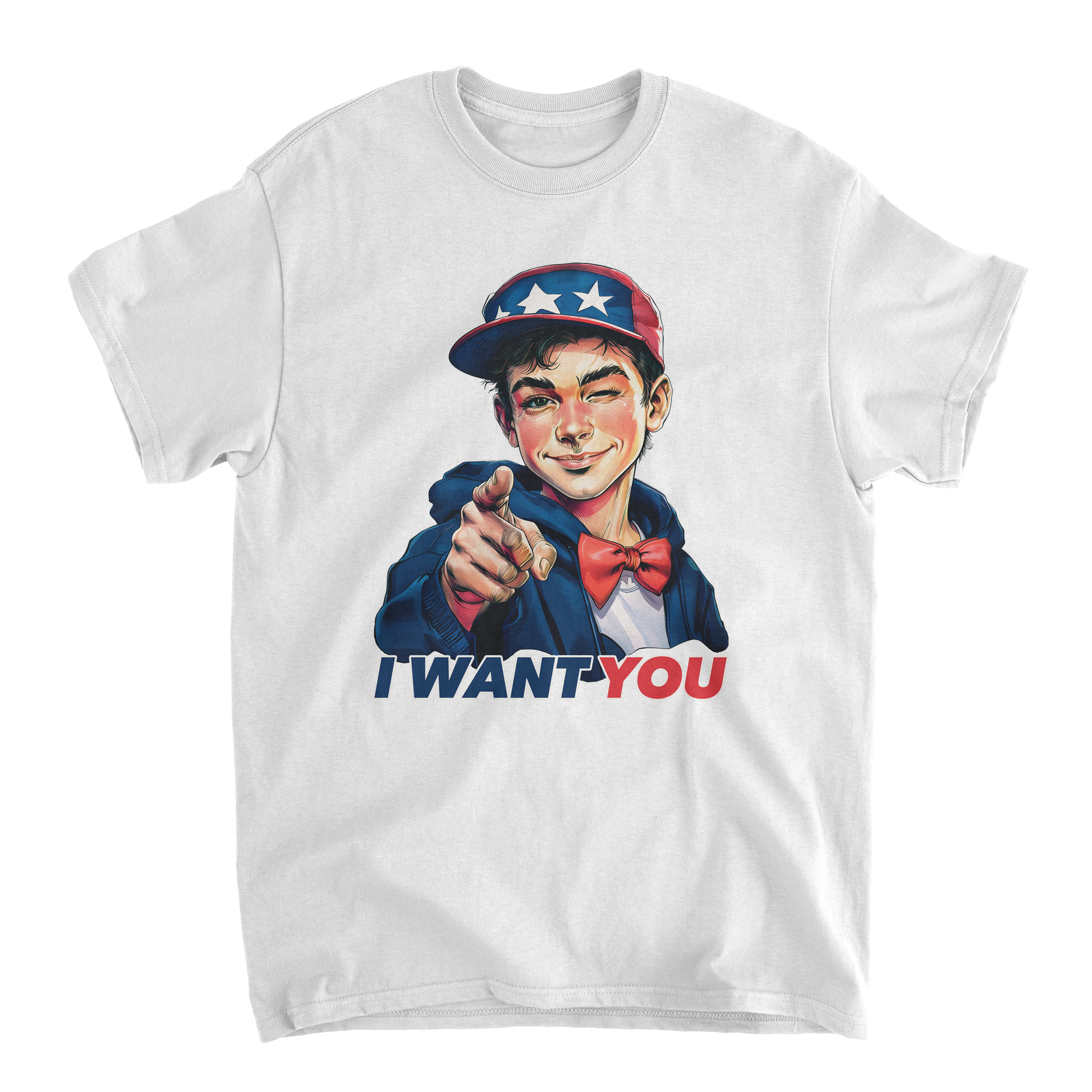 This graphic T-shirt features a bold and playful twist on the iconic "Uncle Sam" poster, with a young American teen taking center stage, dressed in a modern version of Uncle Sam's famous outfit, sports a stars-themed hat, hoodie, and a red bowtie. Striking the classic "I Want You" pose, the teen points directly outward, engaging the viewer with a confident expression, adding a fun, rebellious vibe to an all-American classic!