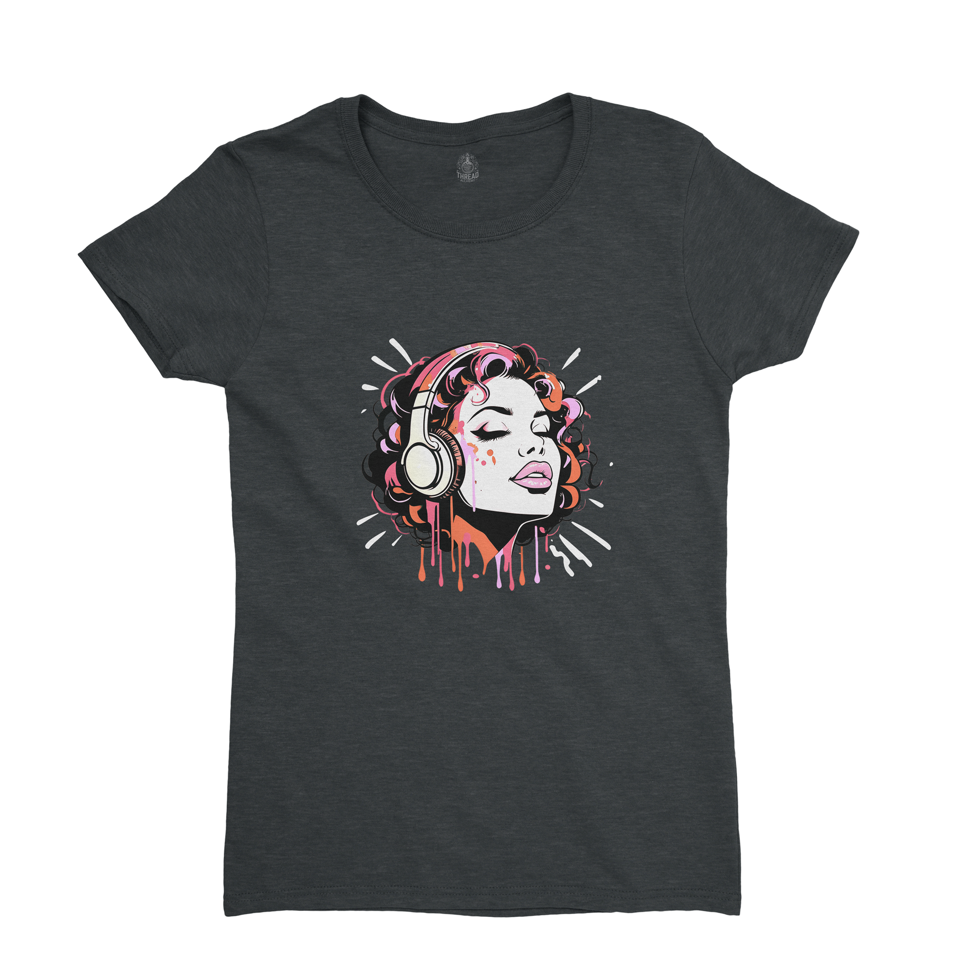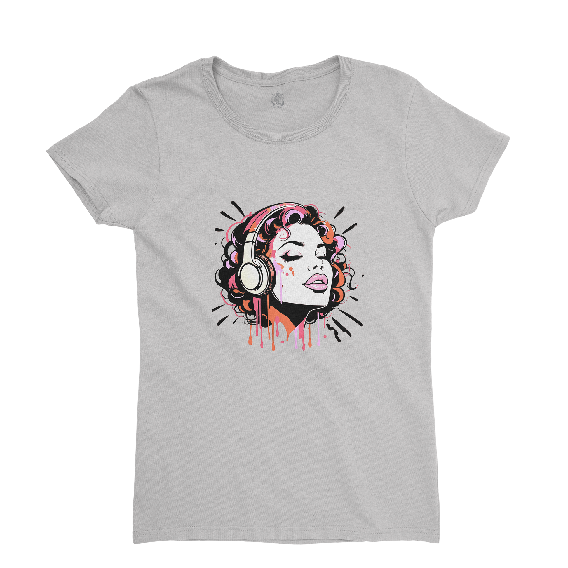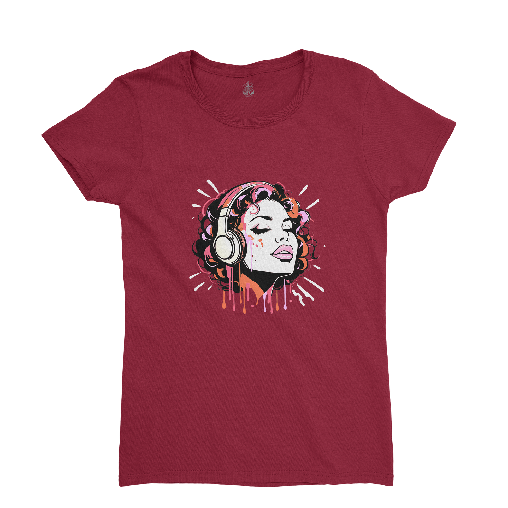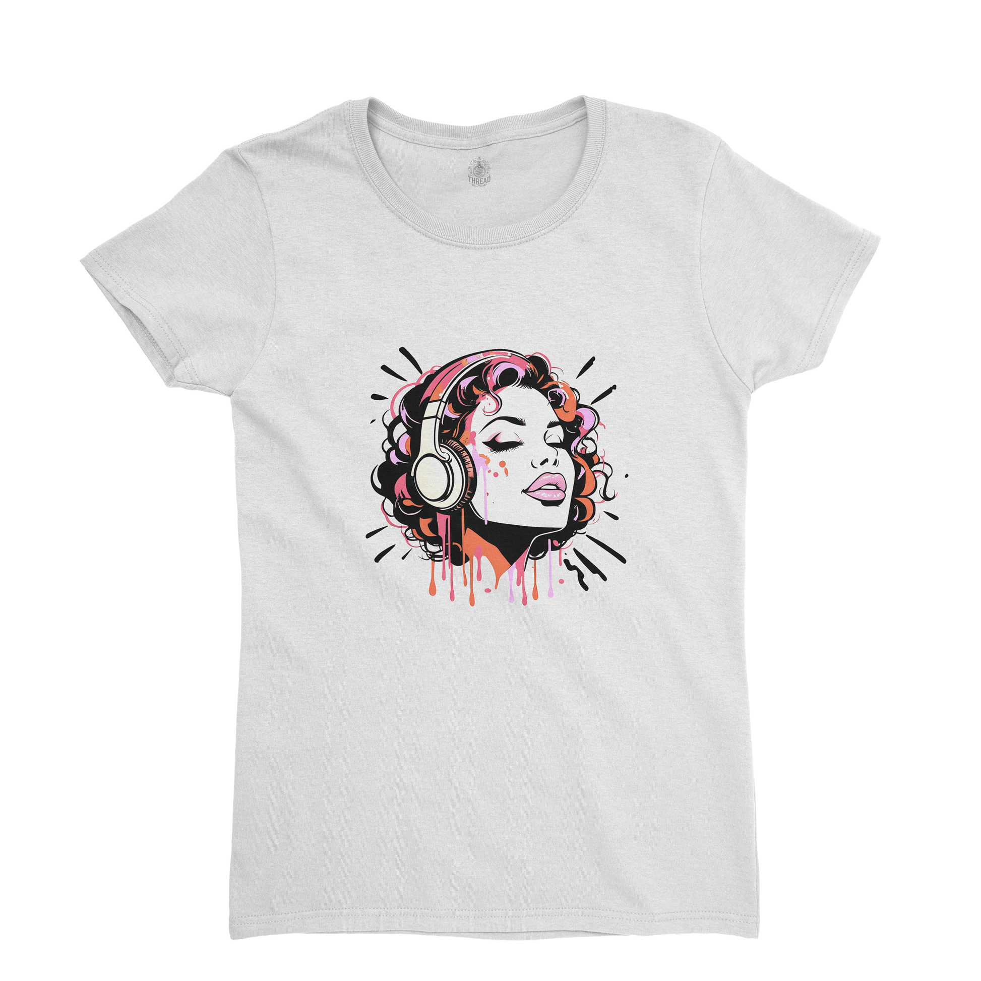 A retro-style young woman, wearing large vintage headphones, listens to music with her eyes closed. Her wavy hair and relaxed expression evoke a nostalgic, 80s vibe. Bold neon colors and subtle cassette tape details complete the look.