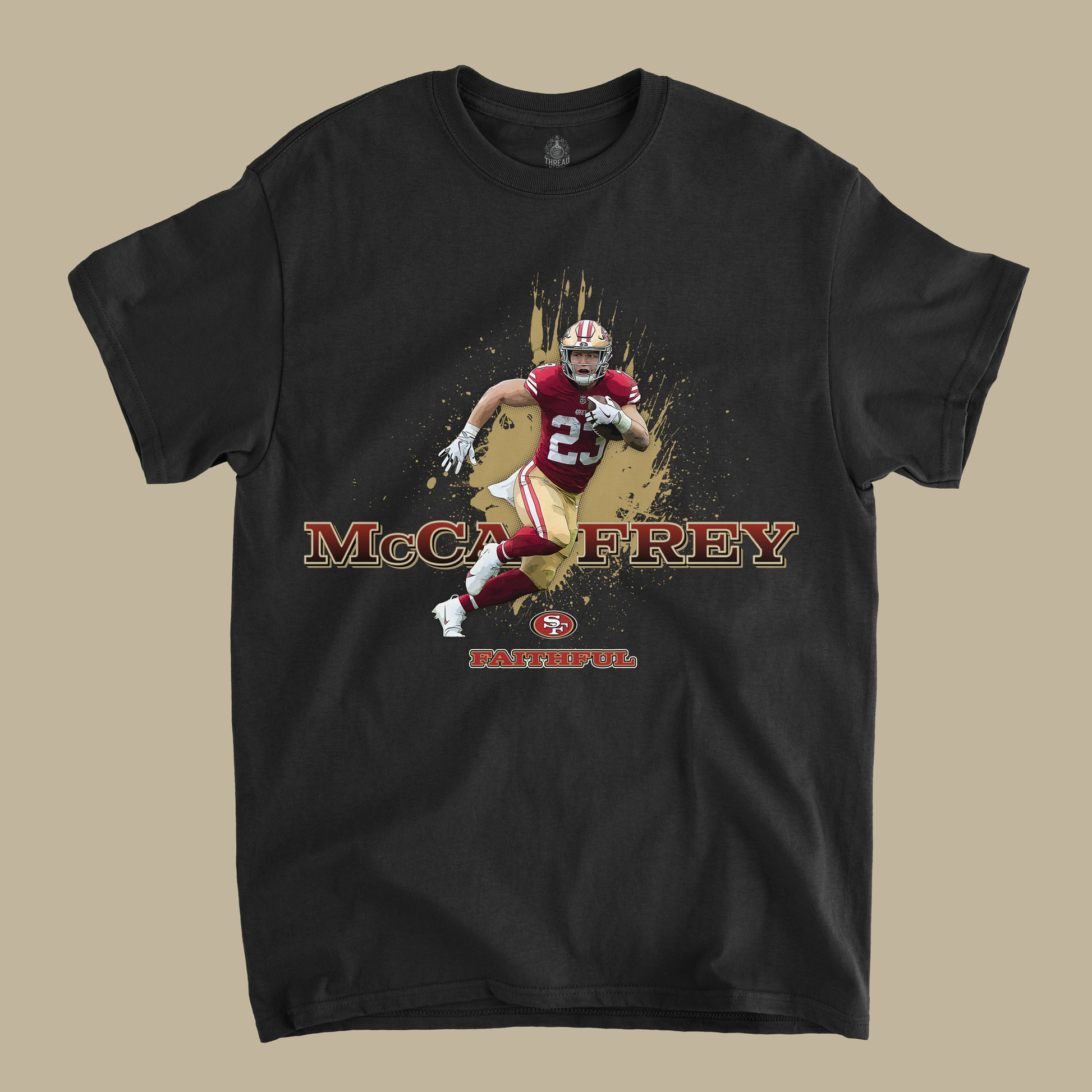 Show your love for the San Francisco 49ers with this dynamic graphic tee featuring star running back Christian McCaffrey! The design captures McCaffrey in action, wearing the iconic red and gold uniform, mid-sprint with the football, showcasing his speed and athleticism. Bold team colors and McCaffrey’s jersey number make this shirt a standout piece for any fan. Perfect for game days or casual wear, this tee is a must-have for Niners faithful who admire one of the NFL's most electrifying players.