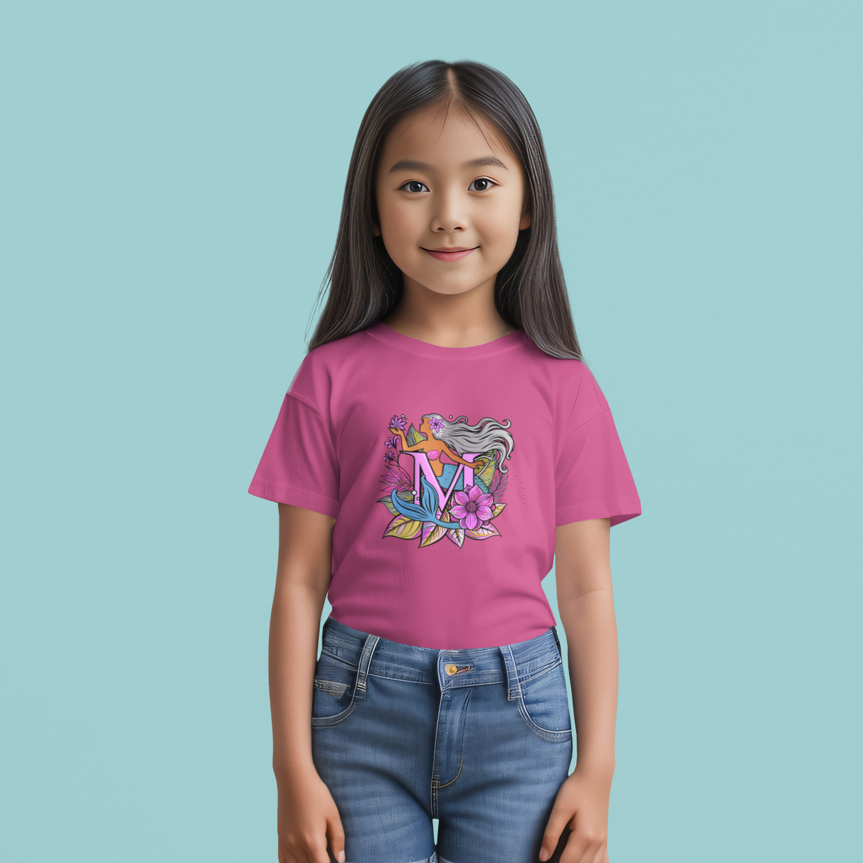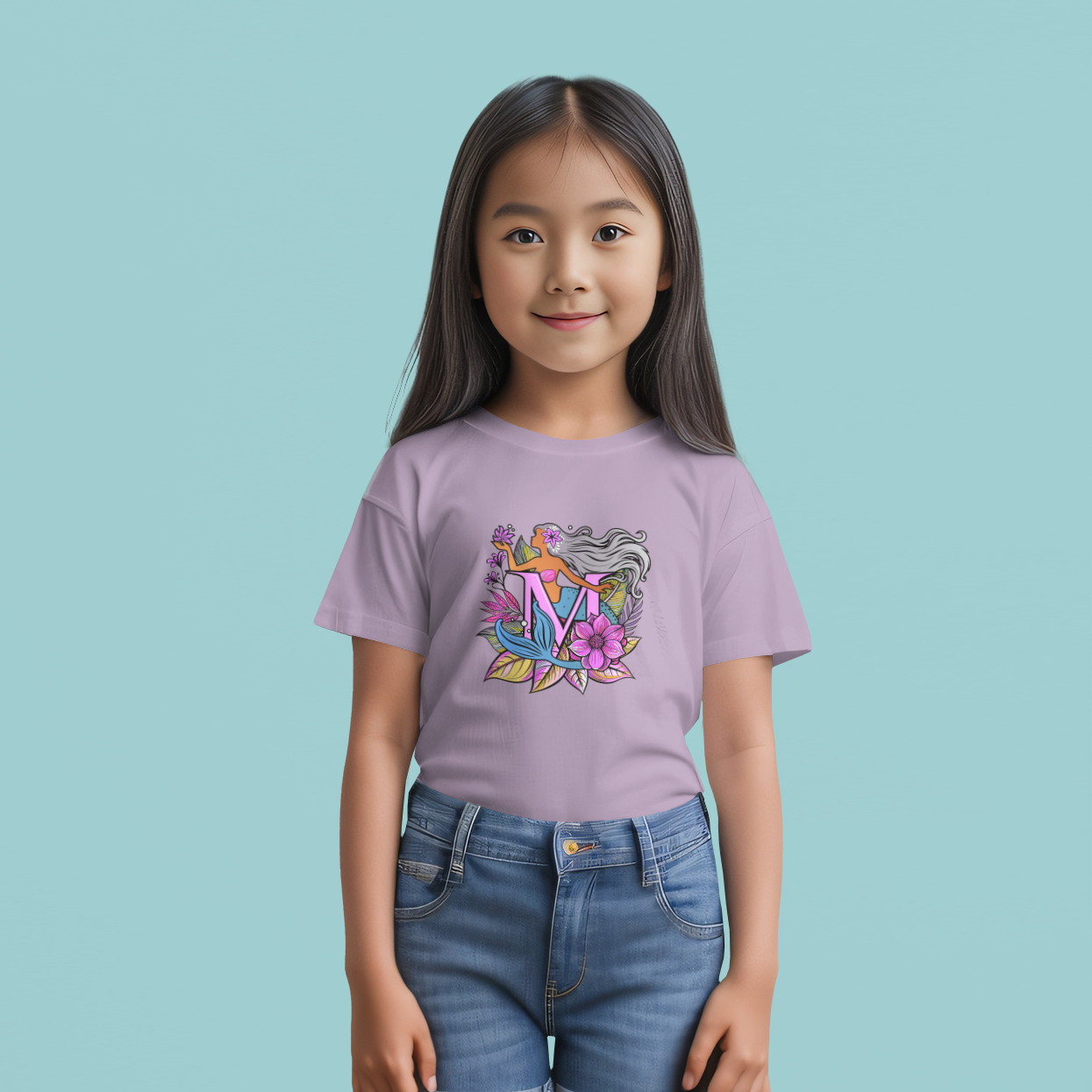 Make a splash with this vibrant girls' graphic t-shirt featuring a playful mermaid design! The enchanting mermaid is emblazoned with a bold letter 'M', surrounded by a burst of colorful tropical flowers. Perfect for ocean lovers, this soft and comfortable tee brings a touch of magic and summer vibes to any outfit. Ideal for adventurous girls who dream of underwater worlds and tropical adventures!