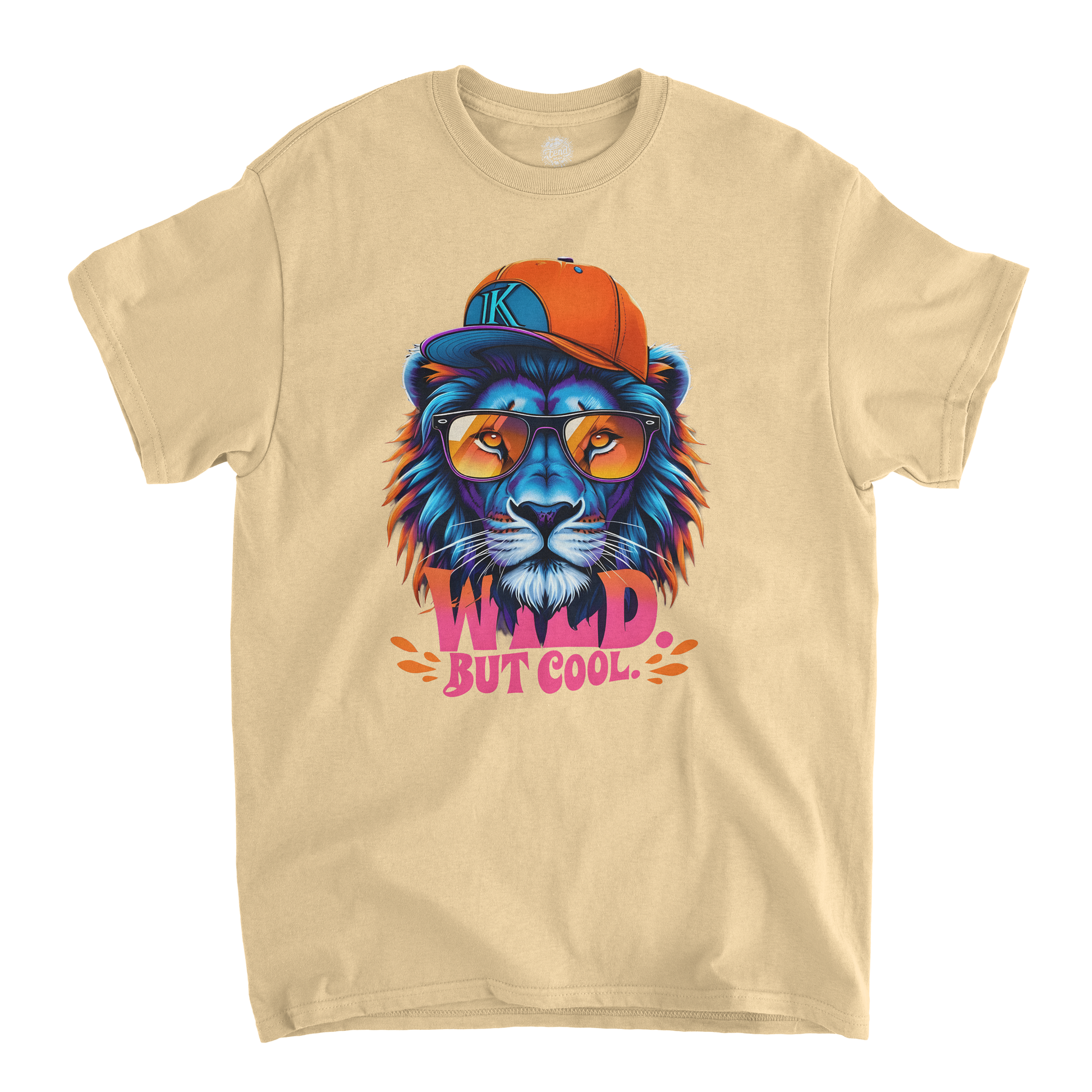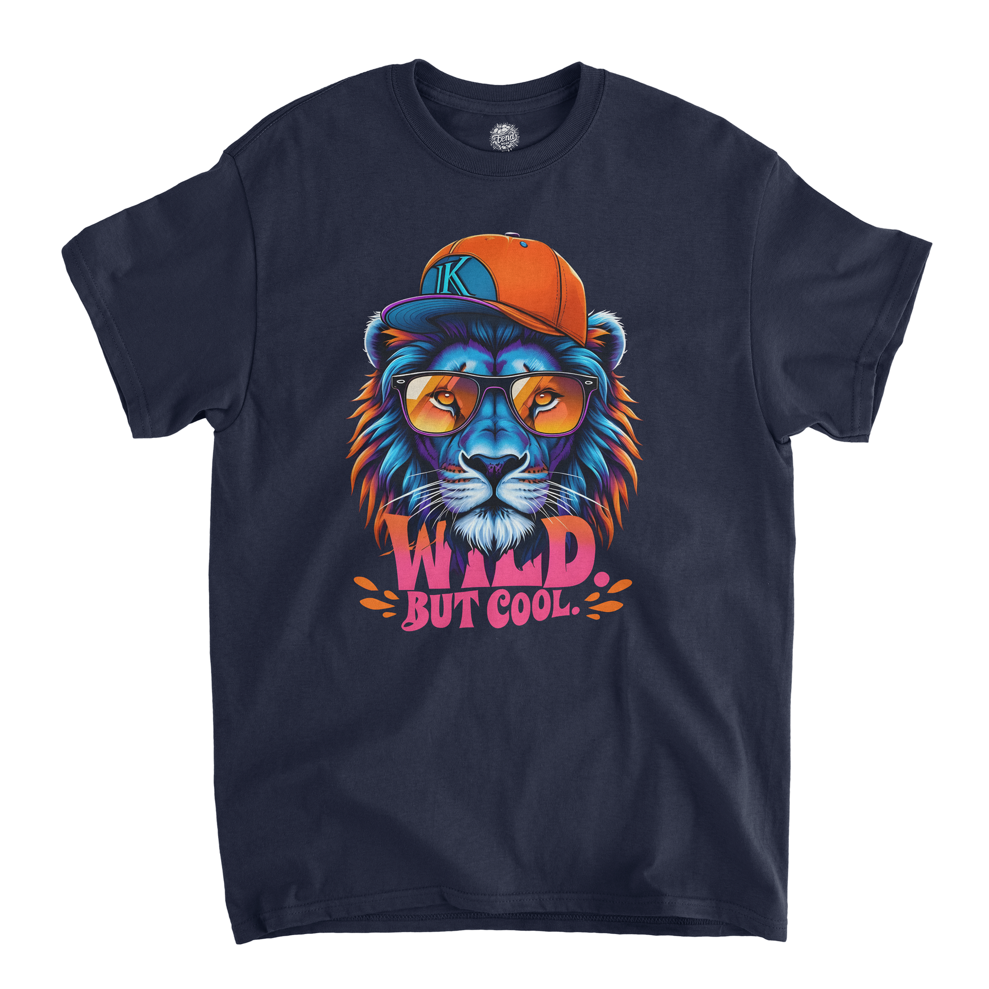 This design features a vibrant, bold lion as the central figure, its majestic face exuding strength and confidence. The lion's mane is an electrifying blue, styled in dynamic, flowing lines that give it a cool, rebellious vibe. Adding to its modern, street-style look, the lion is rocking a pair of reflective sunglasses, with hints of the urban skyline mirrored in the lenses. Perched atop its head is a sleek baseball cap, slightly tilted to one side, adding an extra layer of attitude. The colors are a mix of vivid blues, oranges, and yellows, creating a striking contrast that draws attention. The design embodies a playful mix of wild nature and urban cool.